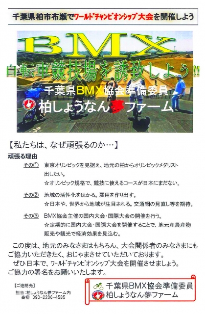 千葉県BMX協会設立準備がなされ、地域住民の方々への説明及び賛同署名活動を行い、すでに住民の6割以上の世帯から署名をいただいているとのことです。現在、広く全国から賛同の署名を集める活動を行なっており、日本ランニングバイク連盟も署名活動に協力することになりました。心強い!