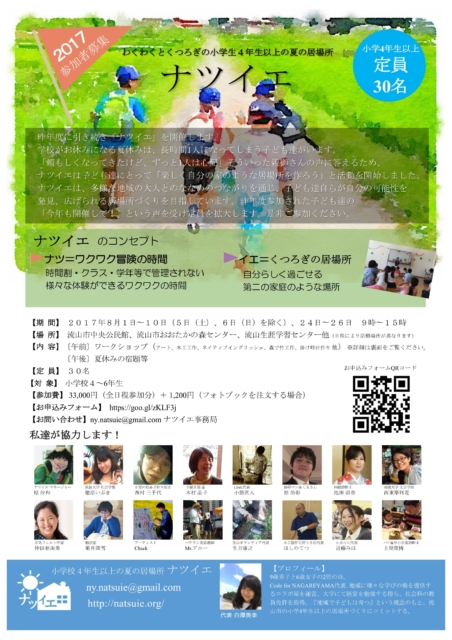 また、小学校4年生以上を対象にした流山市の市民団体「ナツイエ」も2017年の参加者募集開始しています。午前は様々なワークショップ、午後は夏休みの宿題等を行います。