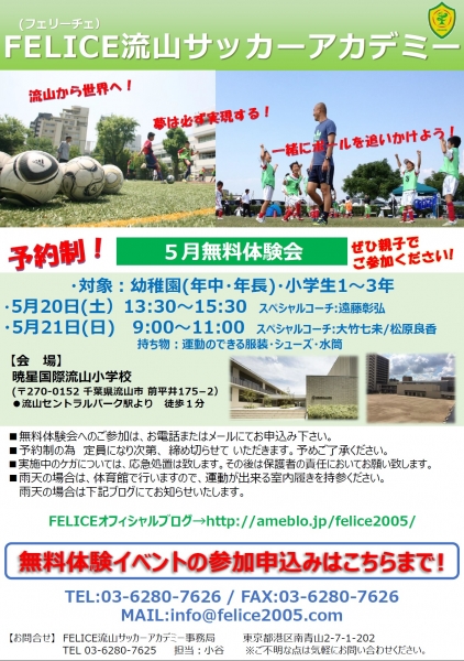 さて、今週末に流山セントラルパーク駅そばの暁星国際流山小学校にて「FELICE流山サッカーアカデミー」による無料体験会が開催されます。スペシャルコーチ軍はそうそうたるメンバーですよ。