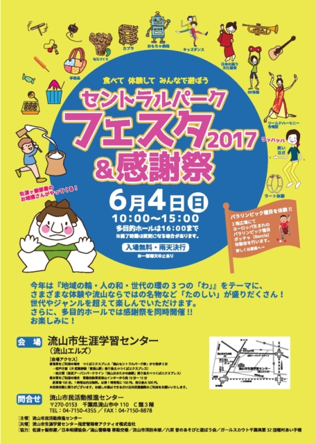 セントラルパークフェスタ2017&感謝祭みなさんこんにちは。数多くある流山イベントのひとつ「セントラルパークフェスタ」が開催されます。今年は地域の輪・人の和・世代の環の3つの「わ」をテーマに、さまざまな体験や流山ならではの名物など「たのしい」が盛りだくさん!とのことです。楽しみですね。