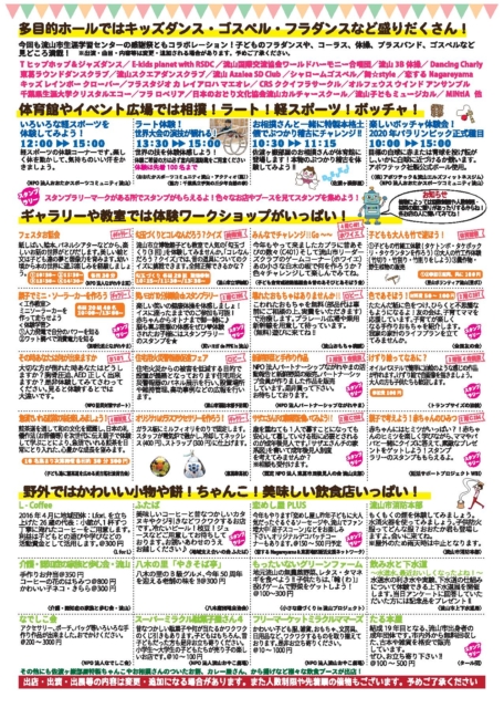 多目的ホールではダンスや子供ミュージカル、体育館では軽スポーツ、そして野外には美味しいお店が出店。また、お相撲さんも登場し特製本格土俵でぶつかり稽古にもチャレンジできるようです。イベント内容をみると、ワークショップも盛りだくさんですので、子供から大人まで楽しめそうです。