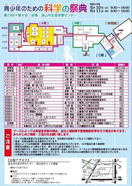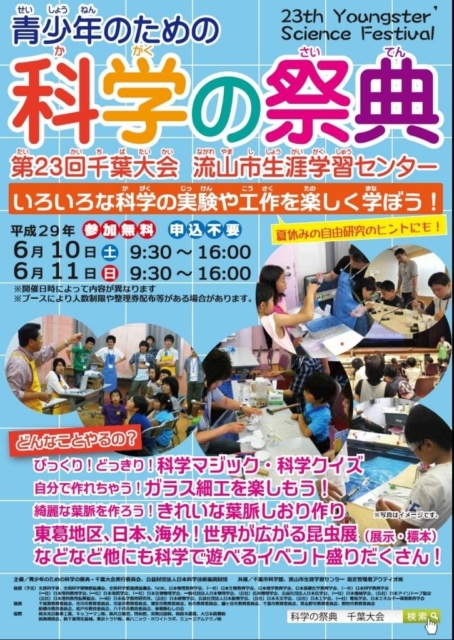 平成29年6月10日・11日の2日間、生涯学習センター(流山エルズ)で「青少年のための科学の祭典」が開催されました。