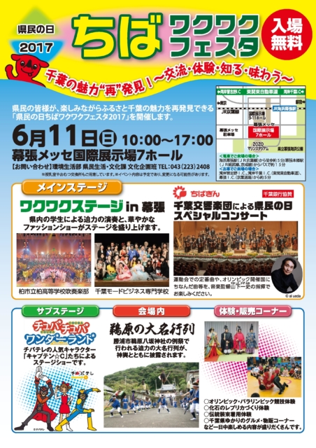 その他にも県内の施設・公園で様々なお得情報がありますので、詳しくはパンフレットをご確認ください。例として東葛地区分だけリンクしておきます。また、6月11日には幕張メッセにて「ちばワクワクフェスタ(入場無料)」も開催されます。こちらは日曜日の開催なので遊びに行きやすいですね。
