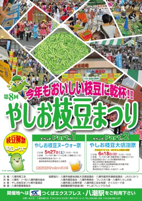 TX沿線上でもある埼玉県の八潮市で「枝豆まつり」が開催されます。TX八潮駅前のフレスポ八潮駐車場で開催されるのでアクセスは抜群。流山からもTX使えば10分くらい出いけます。枝豆試食会、特産品&推奨品即売会、音楽ライブ、利き豆コーナー、枝豆さや飛ばし大会&ゲームetc・・・。枝豆好きな方は行くしかない!