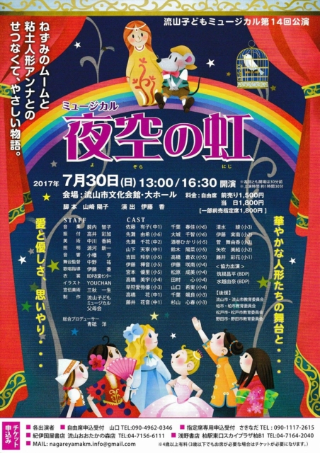そんなミュージカルの児童劇団が流山市にもあります。流山市をはじめとして、柏市、松戸市などの小学生から高校生までの子ども達が、「流山子どもミュージカル」として数々の子供ミュージカルを公演しています。その最新公演の「夜空の虹」が、流山市文化会館で開催されます。