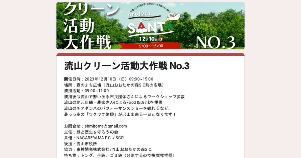 第3回目は従来クリーン活動に加え「PROJECT SANTA」を実施。お家にある不用品を当日持参し、海外の子供たちへ送ることで、プレゼントを届けるサンタになる魅力的なプロジェクトです。リユース品の回収も会場で実施されます。そして、街を綺麗にした後もお楽しみイベント盛りだくさん。キッチンカーやワークショップ、ステージショーも開催されます。ジャンボリーミッキーを踊ったり、「Nagareyama F.C」のサッカー選手と一緒に触れ合う事もできるようです。
